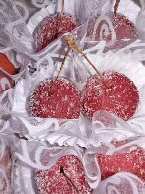 - نخلط ماء الزهر مع الملون الأحمر و نغطس فيه الكريات ثم نغطيهم بالسكر ثم نضع كل 2 كريات في قالب ورقي واحد ثم نلصق فيهم أعواد الكرز