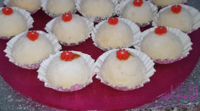 - نخلط جوز الهند مع السكر ثم نطحنهم مع بعض، ثم نضيف الفرينة و زاست و عصير الليمون و نخلط، ثم نضيف البيض تدريجيا و نخلط جيدا حتى يصبح الخليط متماسك....