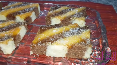 - ندخل الحلوة للفرن ساخن على 180 درجة حتى تأخذ لون احمر فاتح، ثم بعد ما نخرجها مباشرة ندهنها بالمربى و نرشها بجوز الهند، ثم نتركها تبرد تماما قبل تقسيمها الى مربعات.